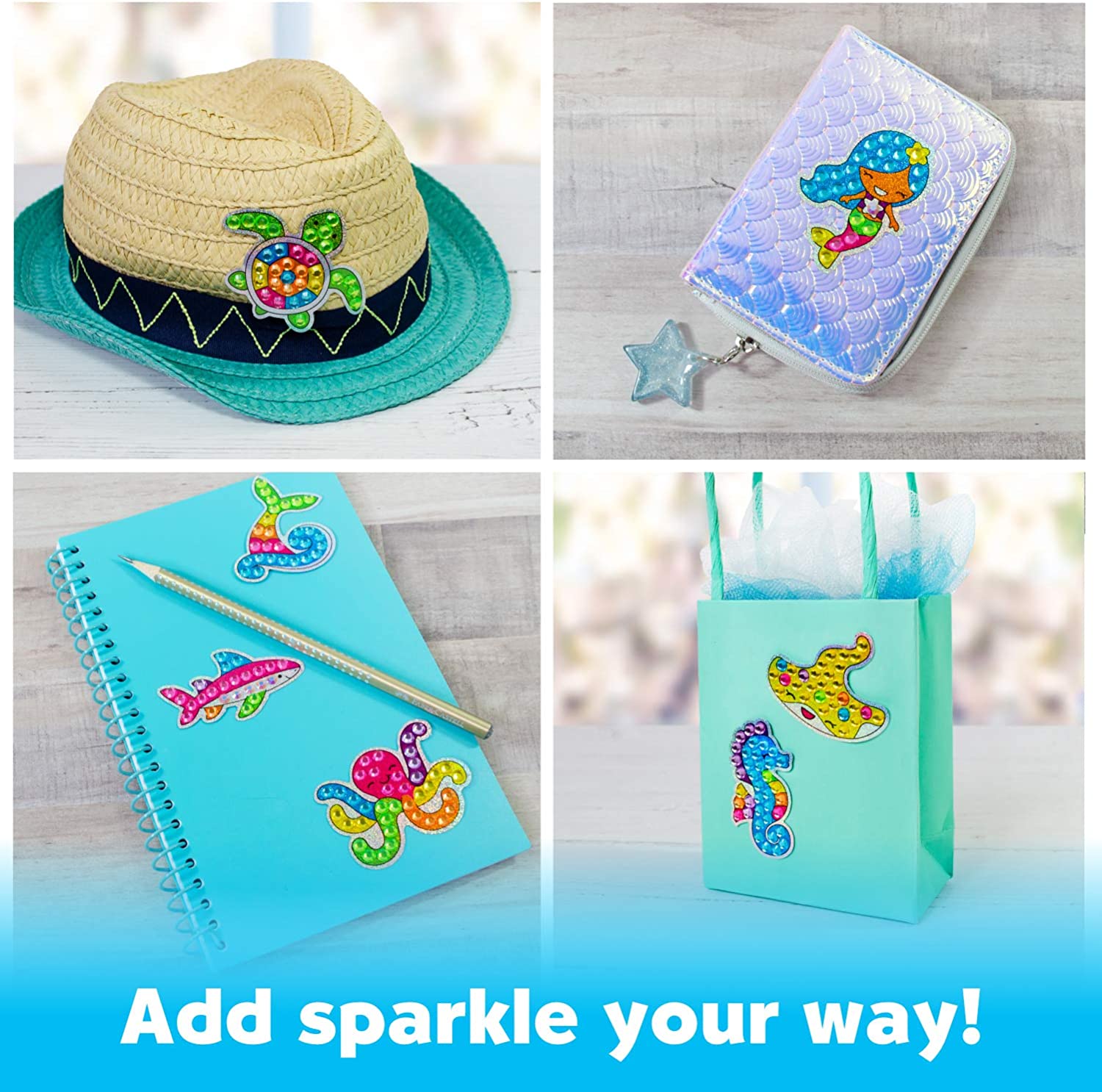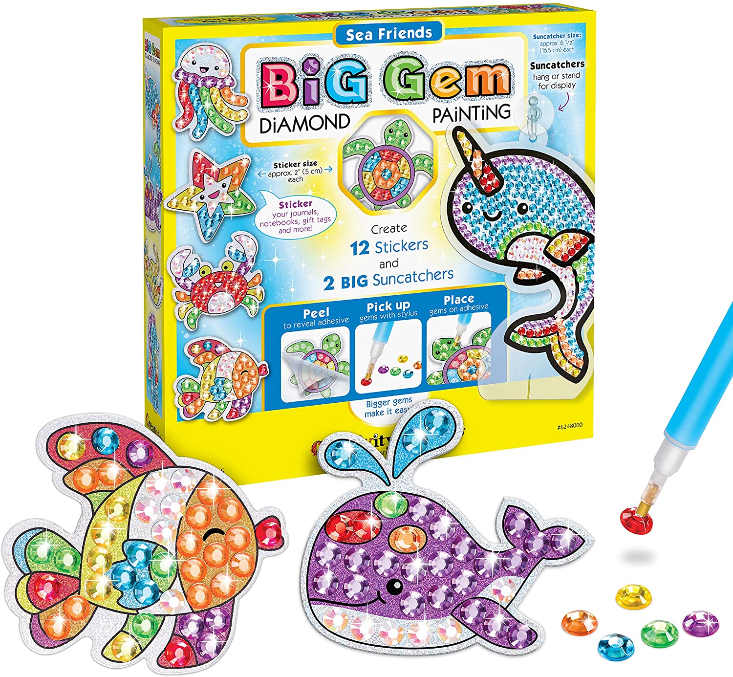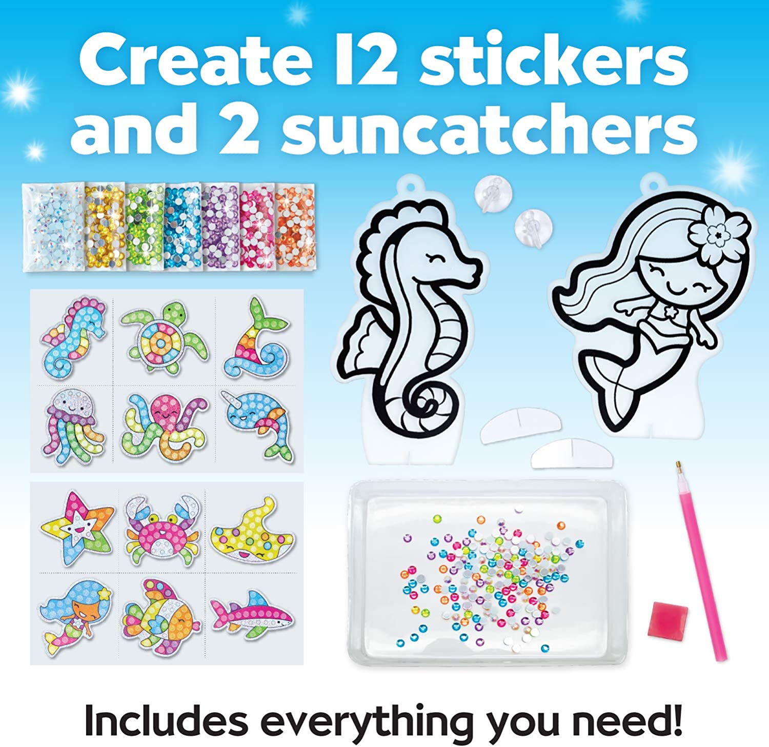 - DIAMOND PAINTING - Create your own diamond art designs! This kids craft combines two diamond painting activities in one. Decorate your backpacks and journals with 12 diamond art stickers and display 2 diamond painted under the sea friends suncatchers